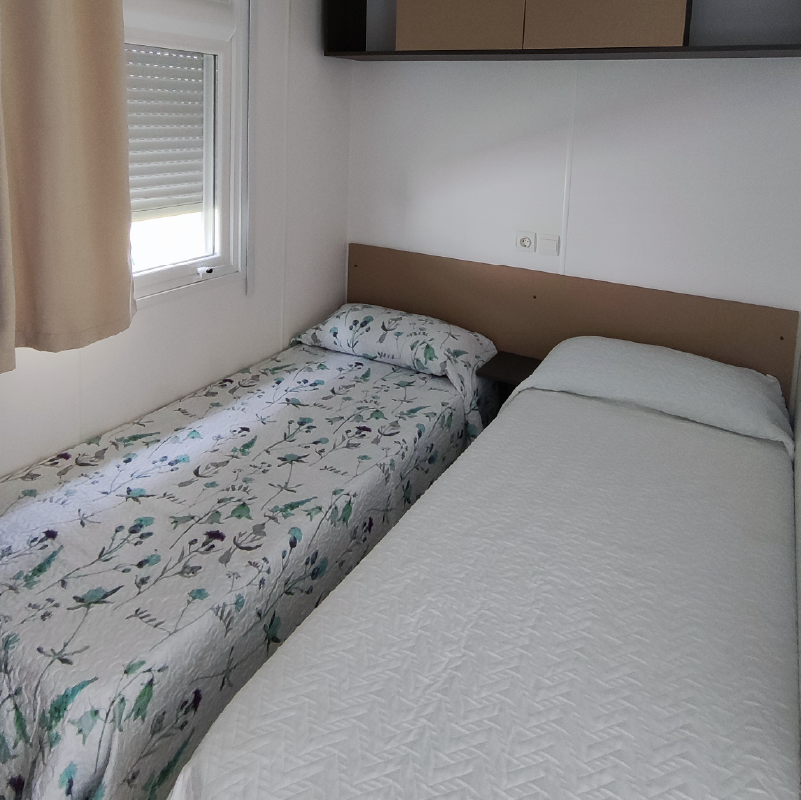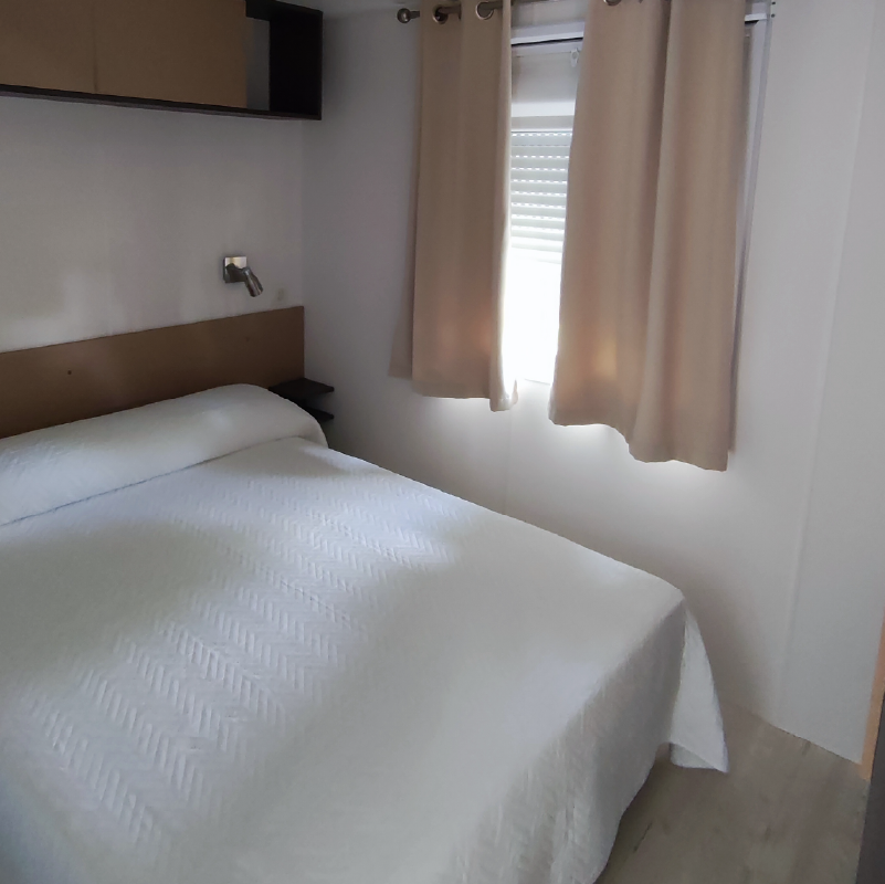 El bungalow número 14+++ tiene tres habitaciones, una con una cama de matrimonio y otras dos con dos camas pequeñas. Como todos nuestros bungalows y mobil-homes viene equipado con cocina completa, baño. Pero no solo eso, este bungalow, además, está equipado con un porche con mobiliario, y una plaza privada para tu coche. Pídenos una barbacoa sin ningún coste adicional. Si estás interesado, puedes ver la disponibilidad de nuestros bungalows.